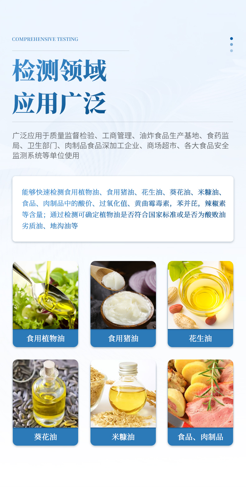 廣泛應用于質量監督檢驗、工商管理、油炸食品生產基地、食藥監局、衛生部門、肉制品食品深加工企業、農業部門、檢驗檢疫部門、商場超市、各大食品安全監測系統等單位使用。