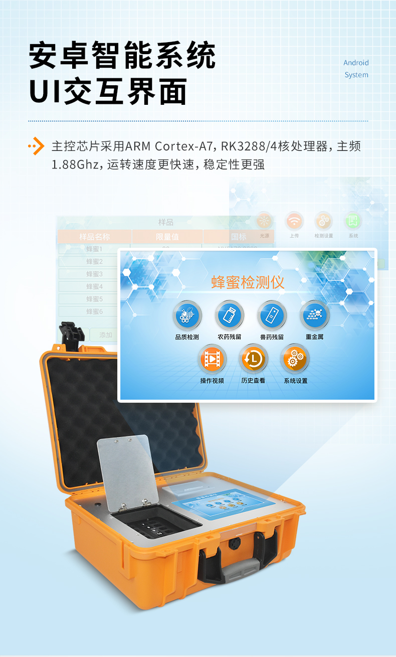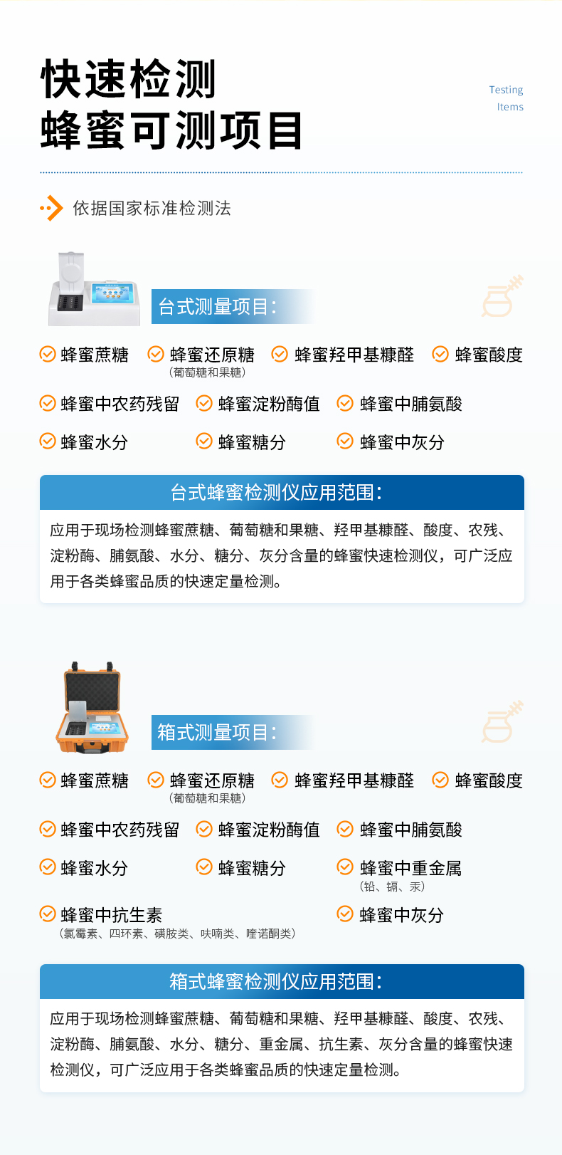 檢測項目:蜂蜜蔗糖、蜂蜜還原糖(葡萄糖和果糖)、蜂蜜羥甲基糠醛、蜂蜜酸度、蜂蜜中農藥殘留、蜂蜜淀粉酶值、蜂蜜中脯氨酸、蜂蜜水分、蜂蜜糖分、蜂蜜中重金屬(鉛、鎘、汞)、蜂蜜中抗生素(氯霉素、四環素、磺胺類、呋喃類、喹諾酮類)、蜂蜜中灰分,應用范圍:應用于現場檢測蜂蜜蔗糖、葡萄糖和果糖、羥甲基糠醛、酸度、農殘、淀粉酶、脯氨酸、水分、糖分、重金屬、抗生素、灰分含量的蜂蜜快速檢測儀,可廣泛應用于各類蜂蜜品質的快速定量檢測。