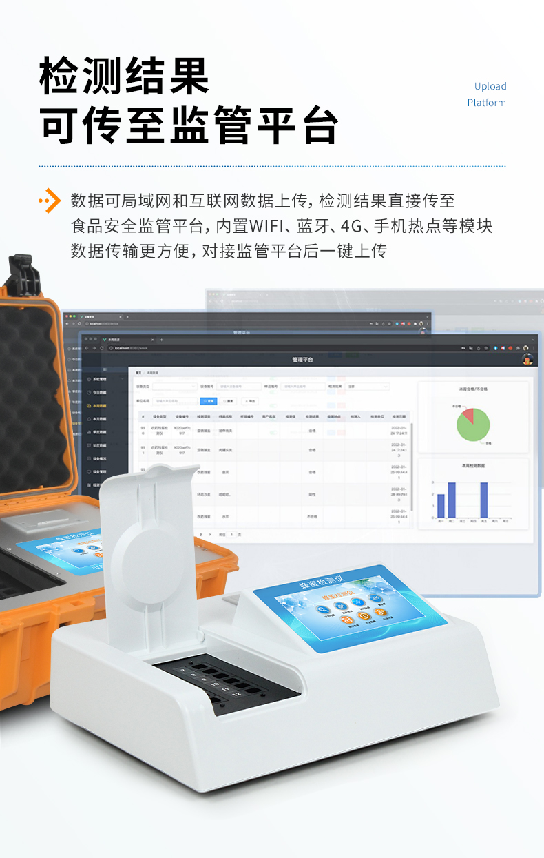 4、儀器帶有監管平臺,數據可局域網和互聯網數據上傳,檢測結果直接傳至食品安全監管平臺。進行區域食品安全監管及大數據分析處理與數據統計,檢測區域食品安全長短期動態,達到食品安全問題預估、預警