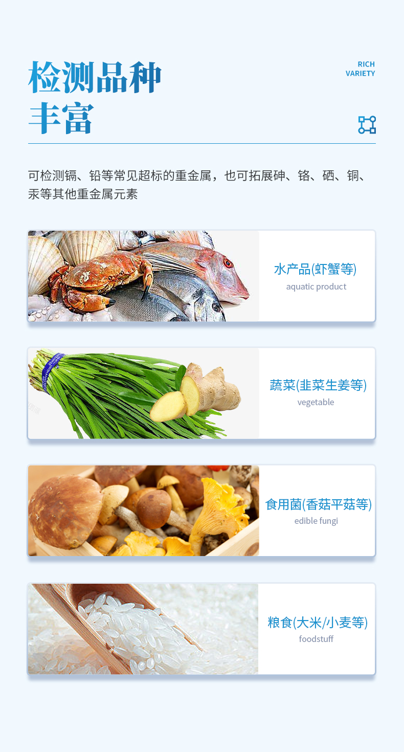 5、應用范圍廣,同時適用于農產品、水產品、加工食品的重金屬現場或實驗室快速分析。