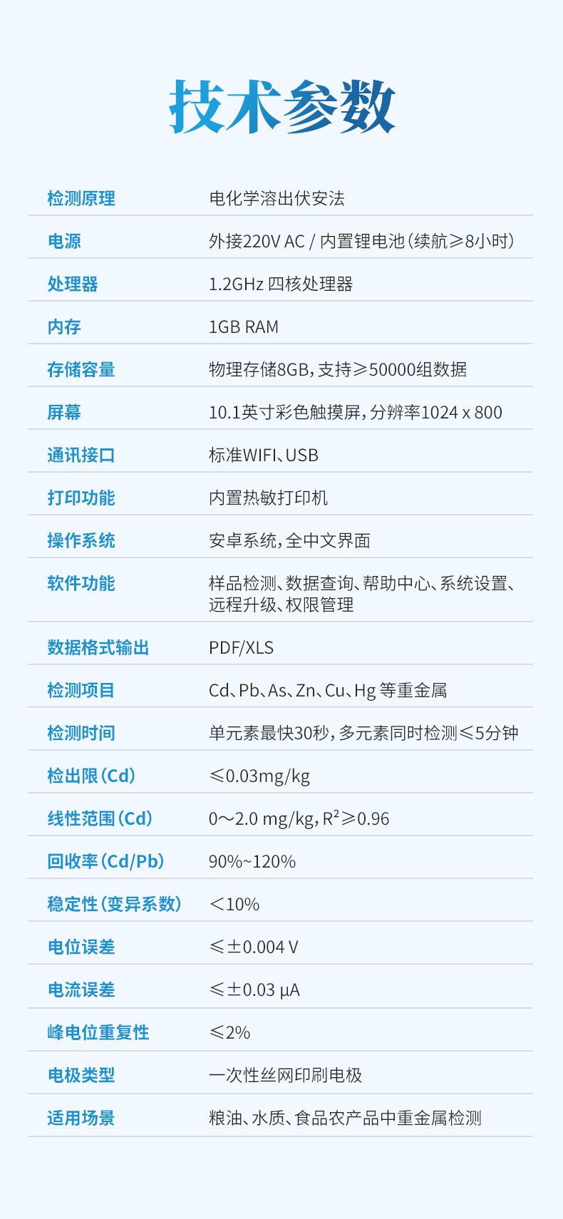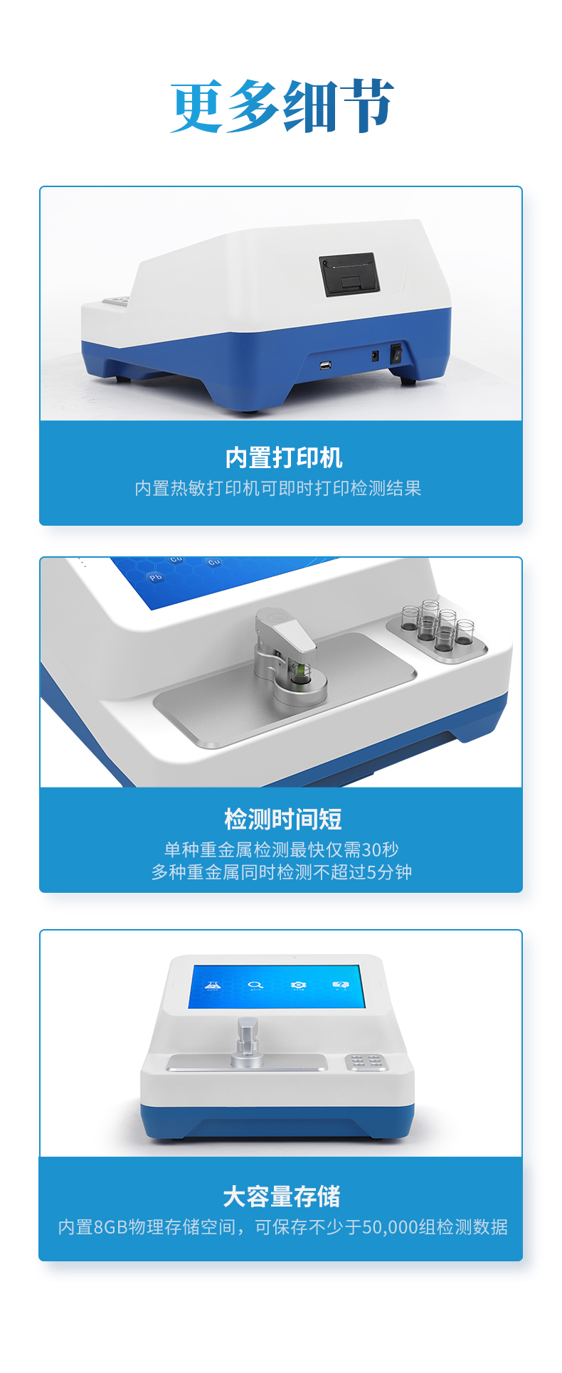 11、測試時間:篩查,單元素≤4分鐘;準確定量,單元素≤9分鐘。鉛、鎘可同時檢測;