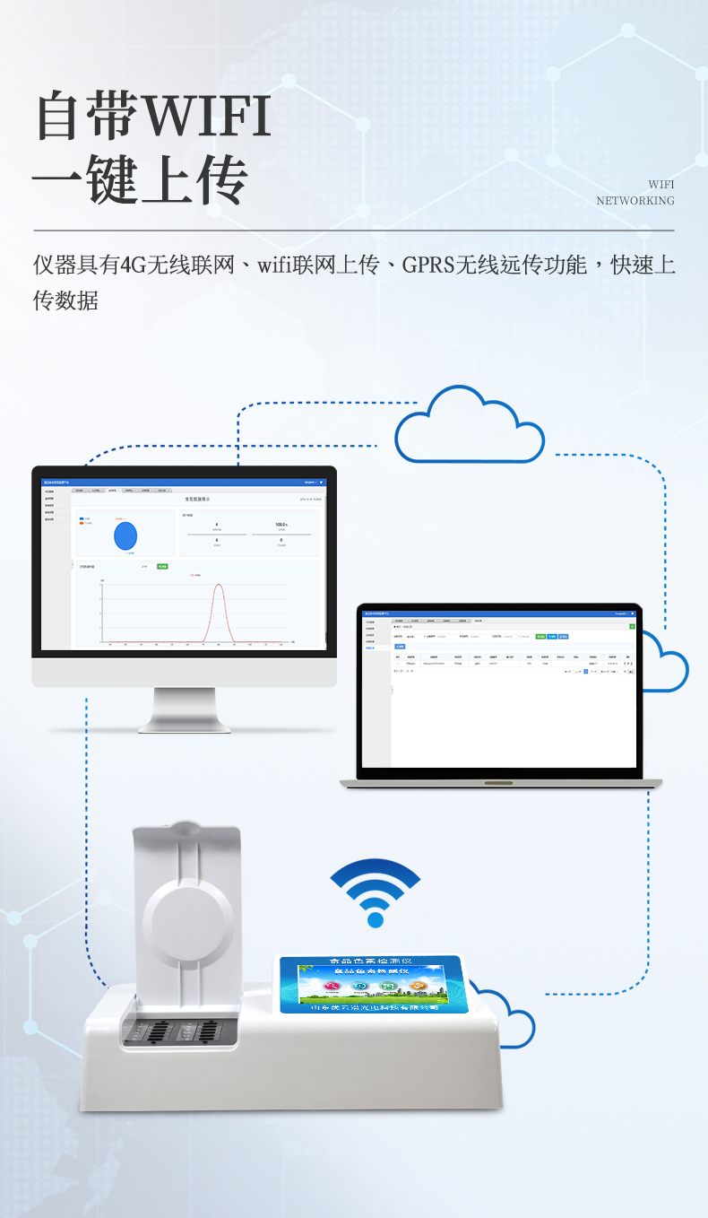 6、儀器帶有監管平臺。數據可局域網和互聯網數據上傳,檢測結果直接傳至食品安全監管平臺。進行區域食品安全監管及大數據分析處理,檢測區域食品安全長短期動態,達到食品安全問題預估、預警