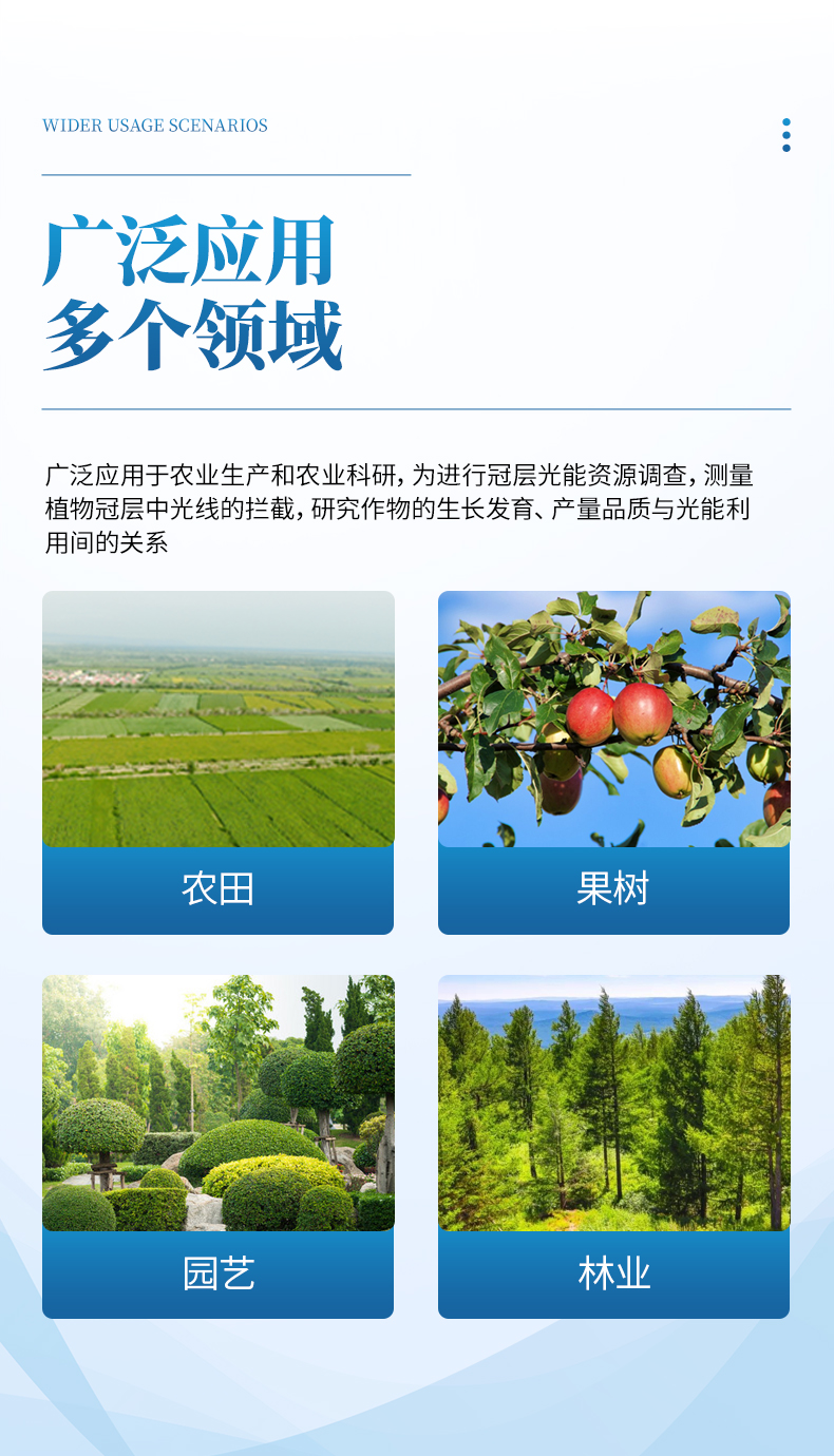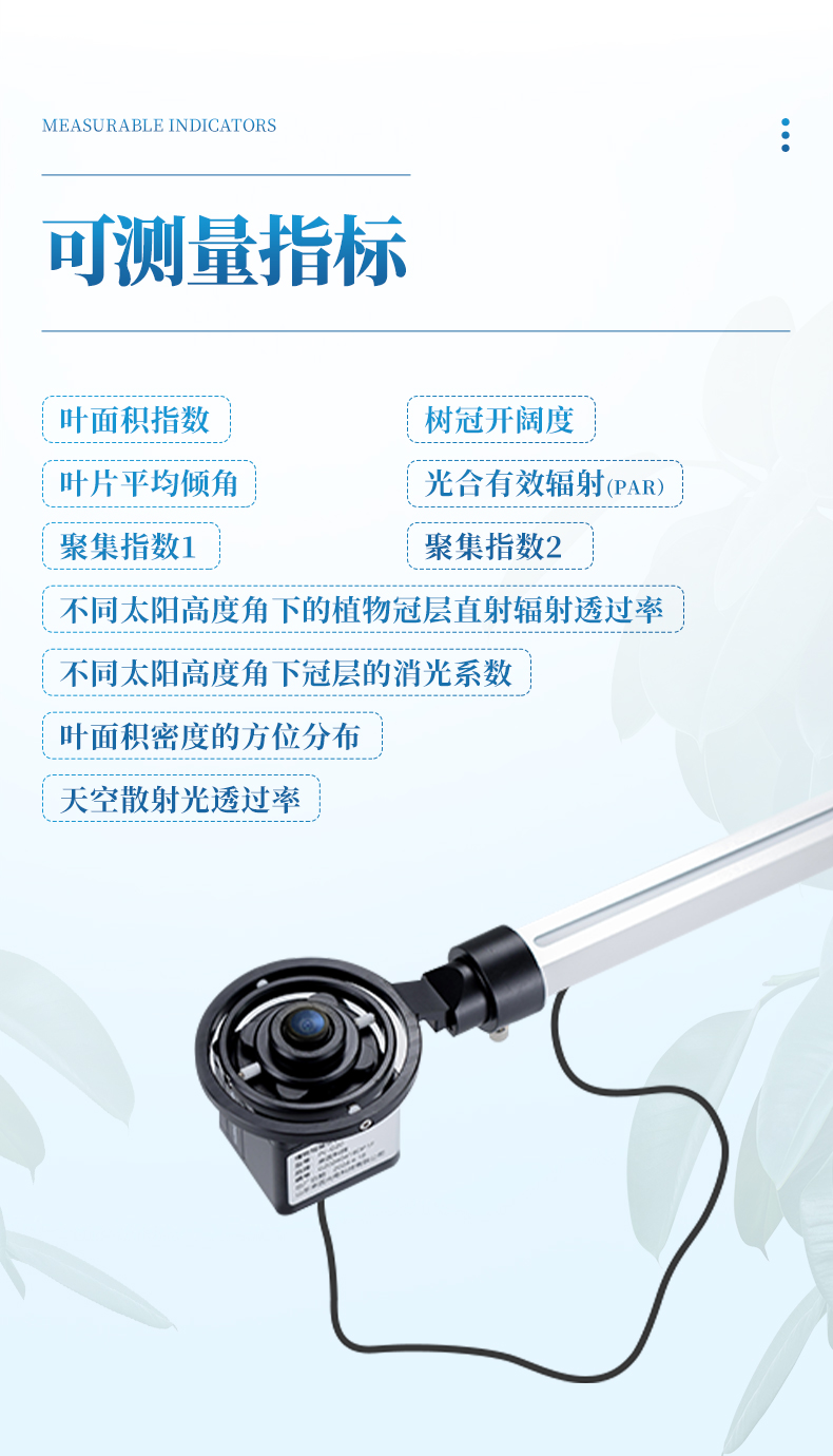 植物冠層圖像分析儀根據(jù)各種圖像處理手段提取多個角度的冠層間隙率,采用裝配魚眼鏡頭的相機從樹冠下向上拍攝冠層照片,利用間隙率參數(shù)來反演出各種冠層參數(shù),導田園合理施肥、現(xiàn)代化農(nóng)場高效管理提供可靠的科學依據(jù),廣泛應用于農(nóng)業(yè)、林業(yè)、植物等科學研究和生產(chǎn)指導。