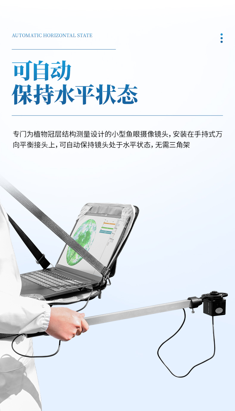 1. 魚眼鏡頭可自動保持水平狀態(tài):專門為植物冠層結(jié)構(gòu)測量設計的小型魚眼攝像鏡頭安裝在手持式萬向平衡接頭上,可自動保持鏡頭處于水平狀態(tài),無需三角架;