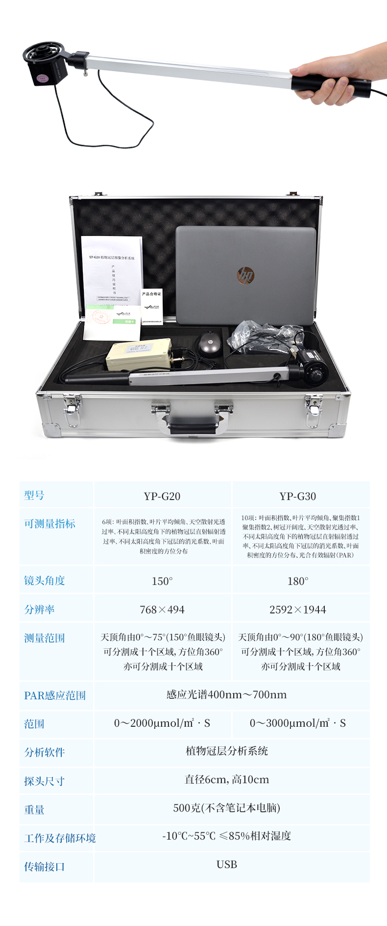 植物冠層圖像分析儀由魚眼圖像捕捉探頭(由魚眼鏡頭及CMOS圖像傳感器組成)、內(nèi)置25個PAR傳感器的測量桿(搖臂)、筆記本電腦、圖像分析軟件組成。魚眼探頭安裝在一個很輕的搖臂的頂端,它可以獲取180°視角的魚眼圖像。圖像的顯示和存貯由配置的筆記本計算機完成。