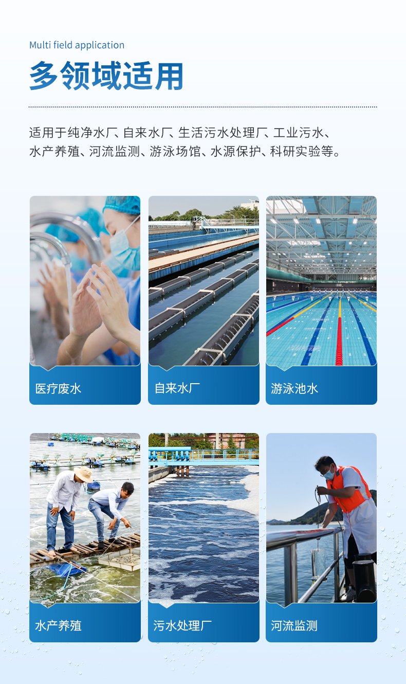適用于純凈水廠、自來水廠、生活污水處理廠、工業污水、水產養殖、河流監測、游泳場館、水源保護、生產監測、科研實驗等。