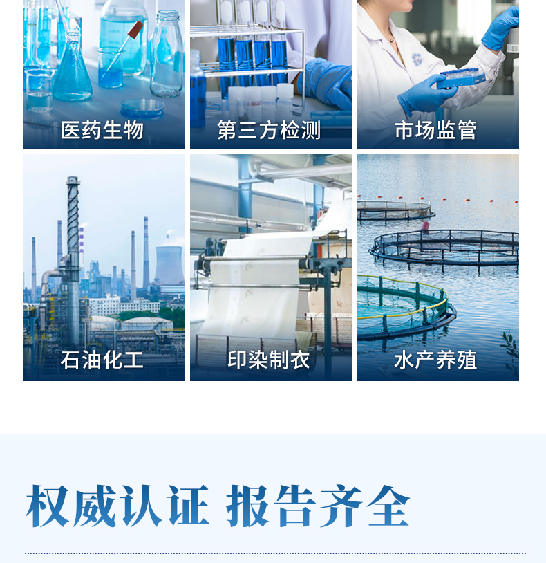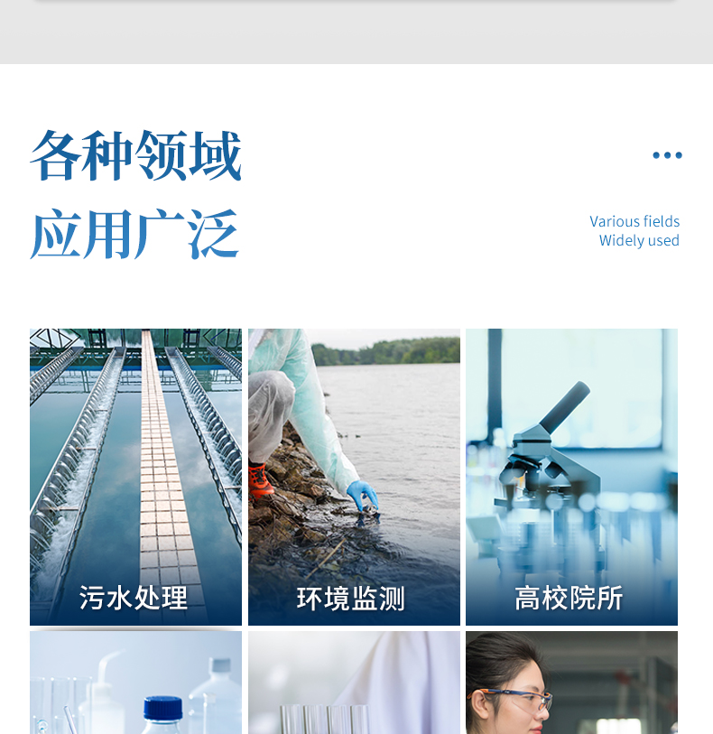 適用于生活污水、工業廢水、地下水、地表水中多種水質污染物的檢測;運用于水質檢測實驗室、市政、污水處理廠、環境監測站及教育科研高校、電廠、疾控中心、造紙電鍍、水產養殖、生物制藥、石化、煤炭、冶金、紡織、食品等行業的水質分析。