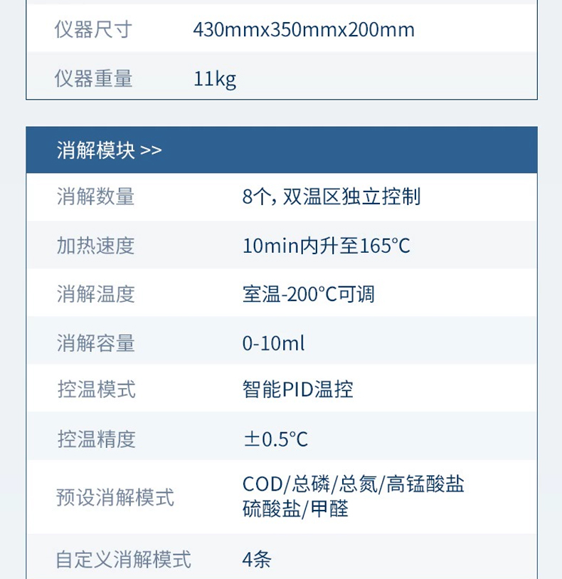 4、內置雙溫區8孔消解儀,左右溫區獨立控制,可對COD總磷總氮等進行快速消解。