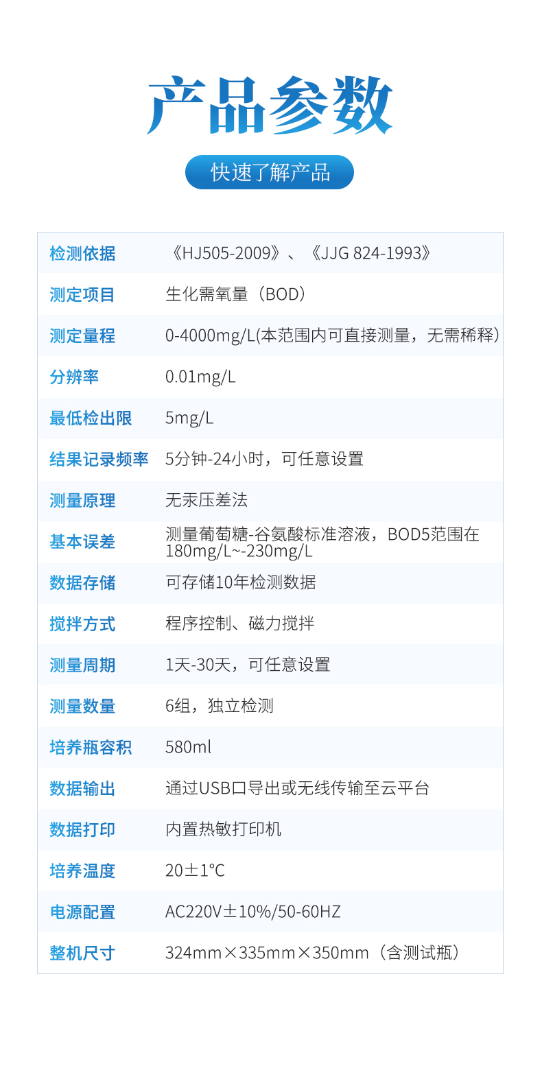 生化需氧量(BOD)測定儀是根據(jù)國家標準《HJ505-2009》5日培養(yǎng)法,模擬自然界中有機物的生物降解過程,采用簡單、安全、可靠的無汞壓差感測法測量水中BOD濃度;全智能化設(shè)計,領(lǐng)先的研發(fā)工藝和設(shè)計制造,實驗過程無需實驗人員值守;適用于排污企業(yè)、環(huán)境監(jiān)測、污水處理廠、第三方檢測機構(gòu)、科研、高校等領(lǐng)域的生化需氧量測定。