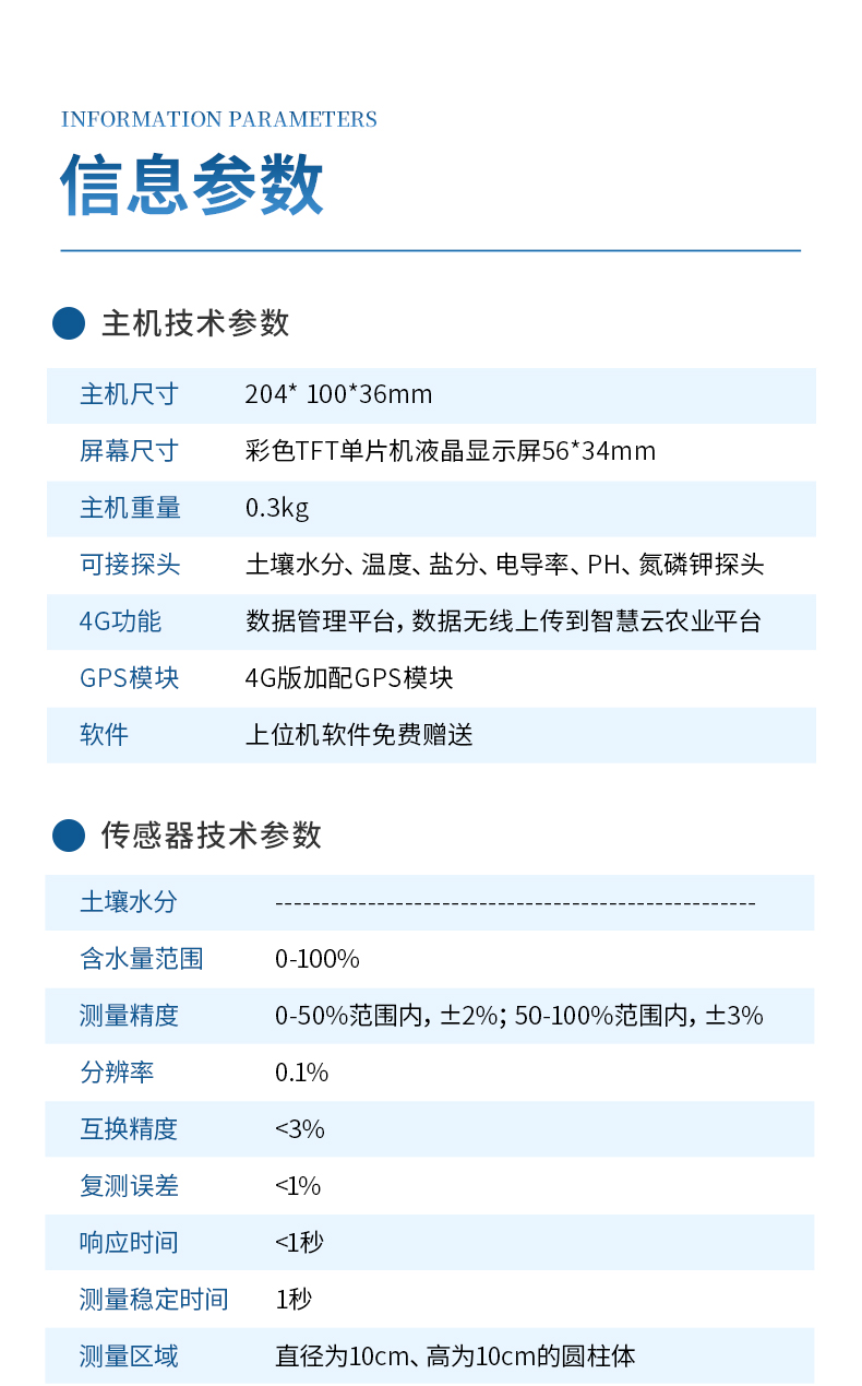 土壤多參數采用一體化結構設計,可快速準確測量土壤中含水量、溫度,可對多處樣地、不同土壤深度的水分含量溫度進行快速檢測和長期連續監測。