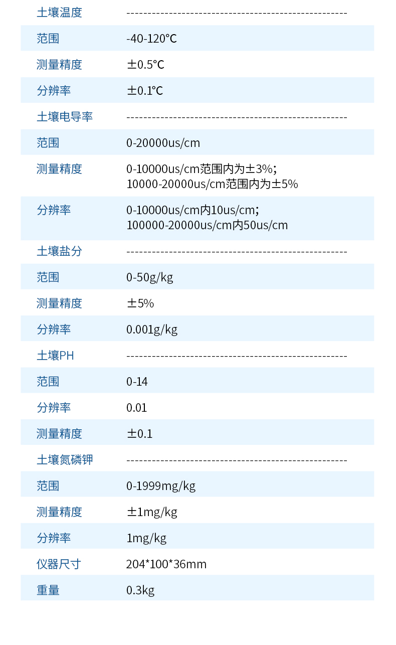 土壤多參數采用一體化結構設計,可快速準確測量土壤中含水量、溫度、電導率(鹽分),可對多處樣地、不同土壤深度的水分含量溫度鹽分進行快速檢測和長期連續監測。
