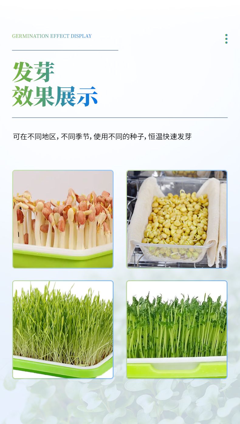 2、此箱可在不同地區不同季節使用不同的種子恒溫快速發芽,由于恒溫的作用,使種子的蛋白酶等化學物質迅速分解反應,避免了溫差出芽造成的能量丟失,使種子出芽后抗病力強,提高幼苗免疫能力,縮短了種子的出芽的時間。經該器械出的幼芽,芽苗質量好,成活率高。