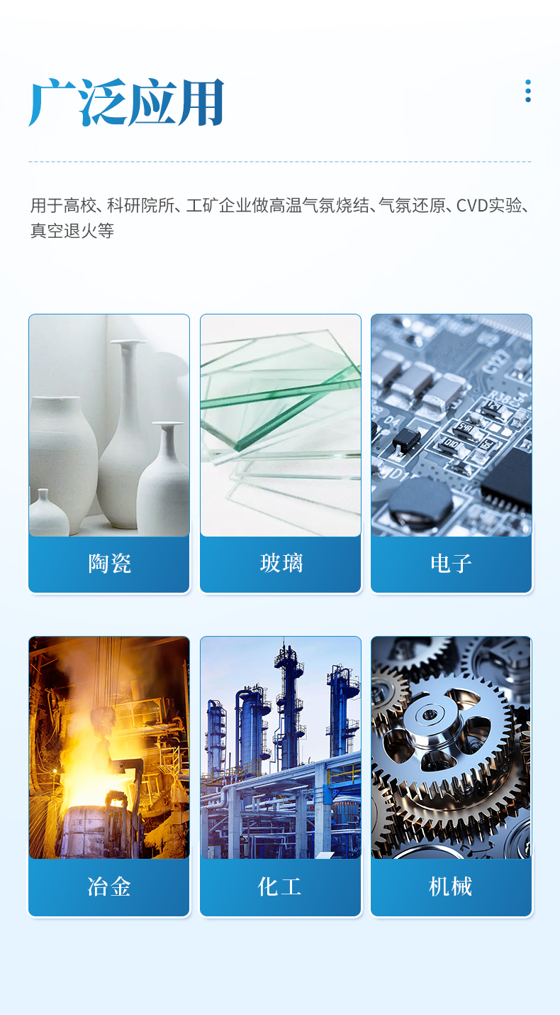 用于高校、科研院所、工礦企業做高溫氣氛燒結、氣氛還原、CVD實驗、真空退火等。具有溫場均勻、升降溫速率快、節能、可通入多重氣體等特點。
