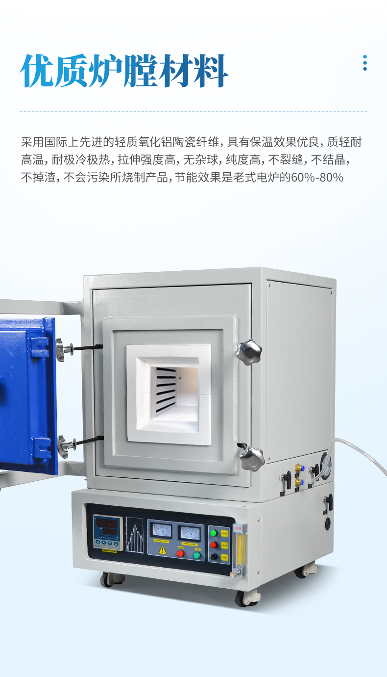 1、爐膛采用優質氧化鋁纖維材料,保溫性能好,耐用,拉伸強度高,無雜球,純度高,節能效果明顯;