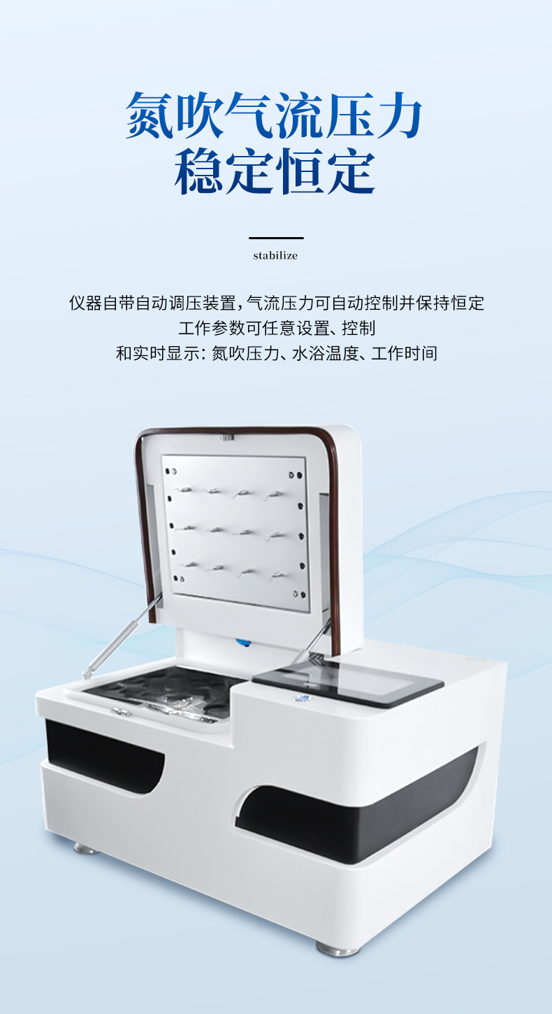 3、工作參數任意設置、控制和實時顯示:主要工作參數:氮吹壓力、水浴溫度和工作時間,均可按需設置。