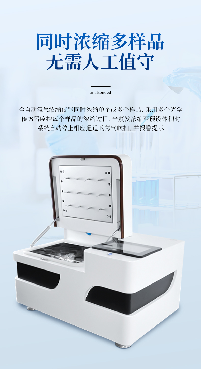 全自動多功能干式氮吹儀YP-QD12G是我司結合實驗室使用需求,從使用者方便安全快捷穩定等多角度共同開發的新型濃縮定容產品,產品擺脫了常規市場上利用水浴加熱揮發而導致樣品進行污染的弊端,確定樣品的安全性與準確性,具有無人值守、準確定容、大批量濃縮的特點,可多組數據儲存功能,實現了全自動化的定量及批量濃縮,濃縮全程,讓繁瑣的濃縮過程變得靈活、省心、高效和安全。