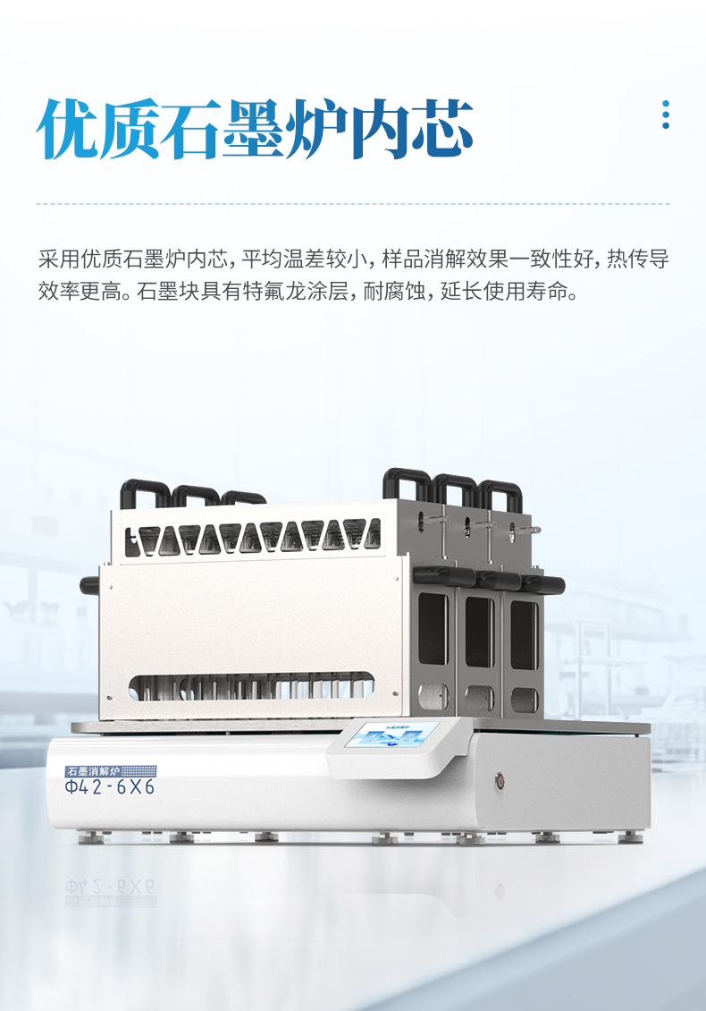 采用優(yōu)質(zhì)石墨爐內(nèi)芯,平均溫差較小,樣品消解效果一致性好,熱傳導(dǎo)效率更高。石墨塊具有特氟龍涂層,耐腐蝕,延長(zhǎng)使用壽命。
