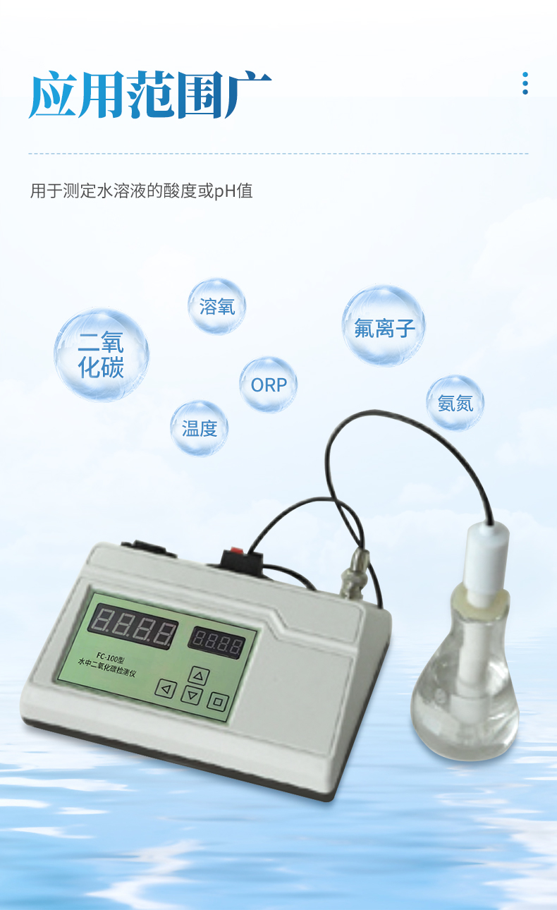 智能化儀器,一鍵標(biāo)定,LED數(shù)顯,測(cè)量范圍0-14pH,精度0.01pH。一機(jī)多用,除測(cè)二氧化碳,還可測(cè)二氧化碳,溶氧,溫度,ORP,氨氮,氟離子等濃度等。