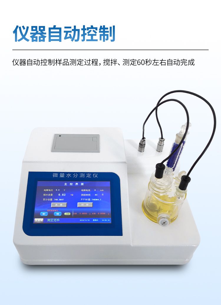 2.儀器具有試驗結果存儲、打印、計算功能;樣品測定過程由儀器自動控制,攪拌、測定60秒左右自動完成,直接顯示測定結果;全密封滴定池瓶,避免試劑與人接觸,也避免環境濕度的影響;儀器中文液晶顯示,并具有自動計算和打印功能,能打印出百分含量、樣品編號、試驗員、實驗日期等內容;儀器準確度為:①水含量小于10微克水時,測量值誤差小于2ug水;②水含量在10微克-1000微克水時,測量誤差≤2ug水;③水含量在1000微克以上時,測量值誤差≤0.2%(不含進樣誤差);