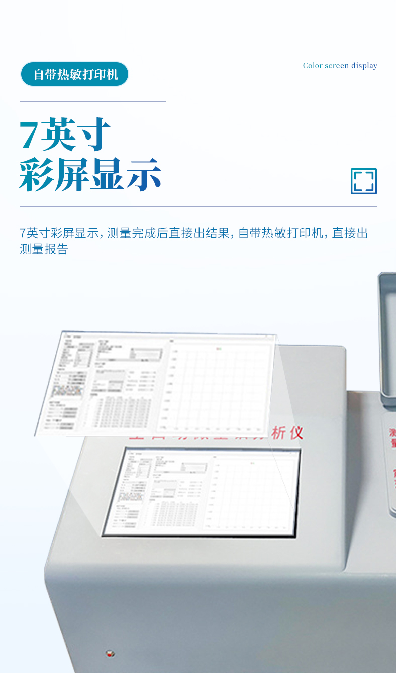 7寸彩屏顯示,測量完成后直接出結果,自帶熱敏打印機,直接出測量報告。