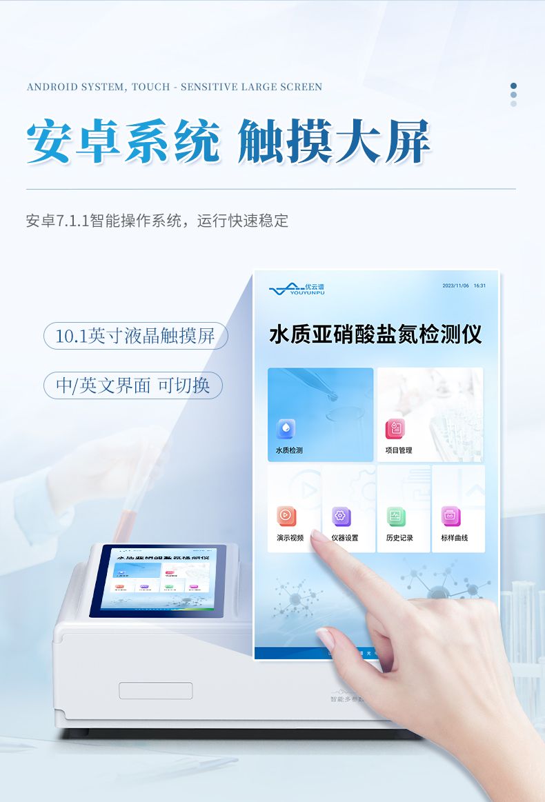 本儀器主要檢測水質(zhì)亞硝酸鹽氮濃度指標(biāo),兼具智能數(shù)據(jù)分析功能,圖表、列表顯示數(shù)據(jù),分析一目了然;高清晰度彩色液晶觸摸顯示屏,Android智能操作系統(tǒng),中文顯示界面,中英文鍵盤,人性化操作,使用更簡單。