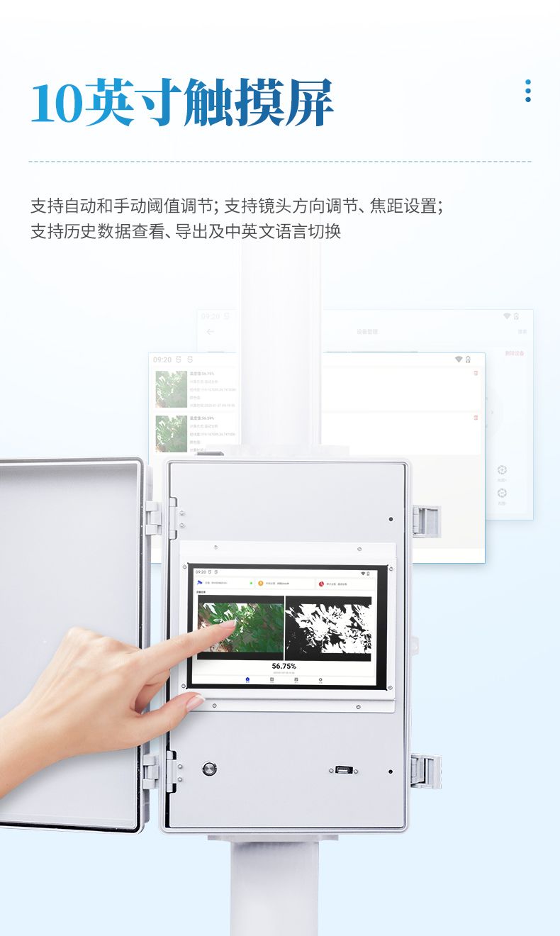 4. 分析主機(jī):10寸彩色觸摸顯示屏,支持自動(dòng)和手動(dòng)閾值調(diào)節(jié);自動(dòng)區(qū)分植被與非植被區(qū)域;支持鏡頭方向調(diào)節(jié)、焦距設(shè)置;支持歷史數(shù)據(jù)查看、導(dǎo)出及中英文語(yǔ)言切換。