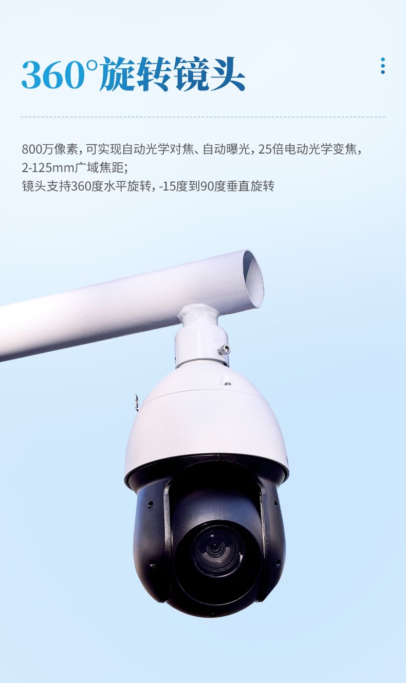 3. 攝像設(shè)備:800萬(wàn)像素,可實(shí)現(xiàn)自動(dòng)光學(xué)對(duì)焦、自動(dòng)曝光,25倍電動(dòng)光學(xué)變焦, 2mm-125mm廣域焦距;鏡頭支持360度水平旋轉(zhuǎn),-15度到90度垂直旋轉(zhuǎn)