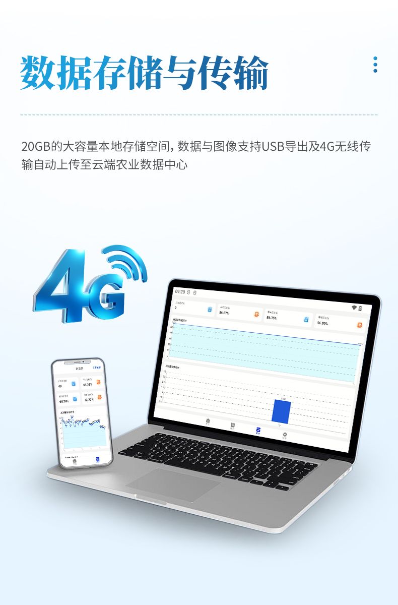 6. 數(shù)據(jù)存儲(chǔ)與傳輸:提供20GB的大容量本地存儲(chǔ)空間,數(shù)據(jù)與圖像支持USB導(dǎo)出及4G無(wú)線傳輸自動(dòng)上傳至云端農(nóng)業(yè)數(shù)據(jù)中心,用戶可通過(guò)專用賬號(hào)訪問(wèn)并以表格形式下載