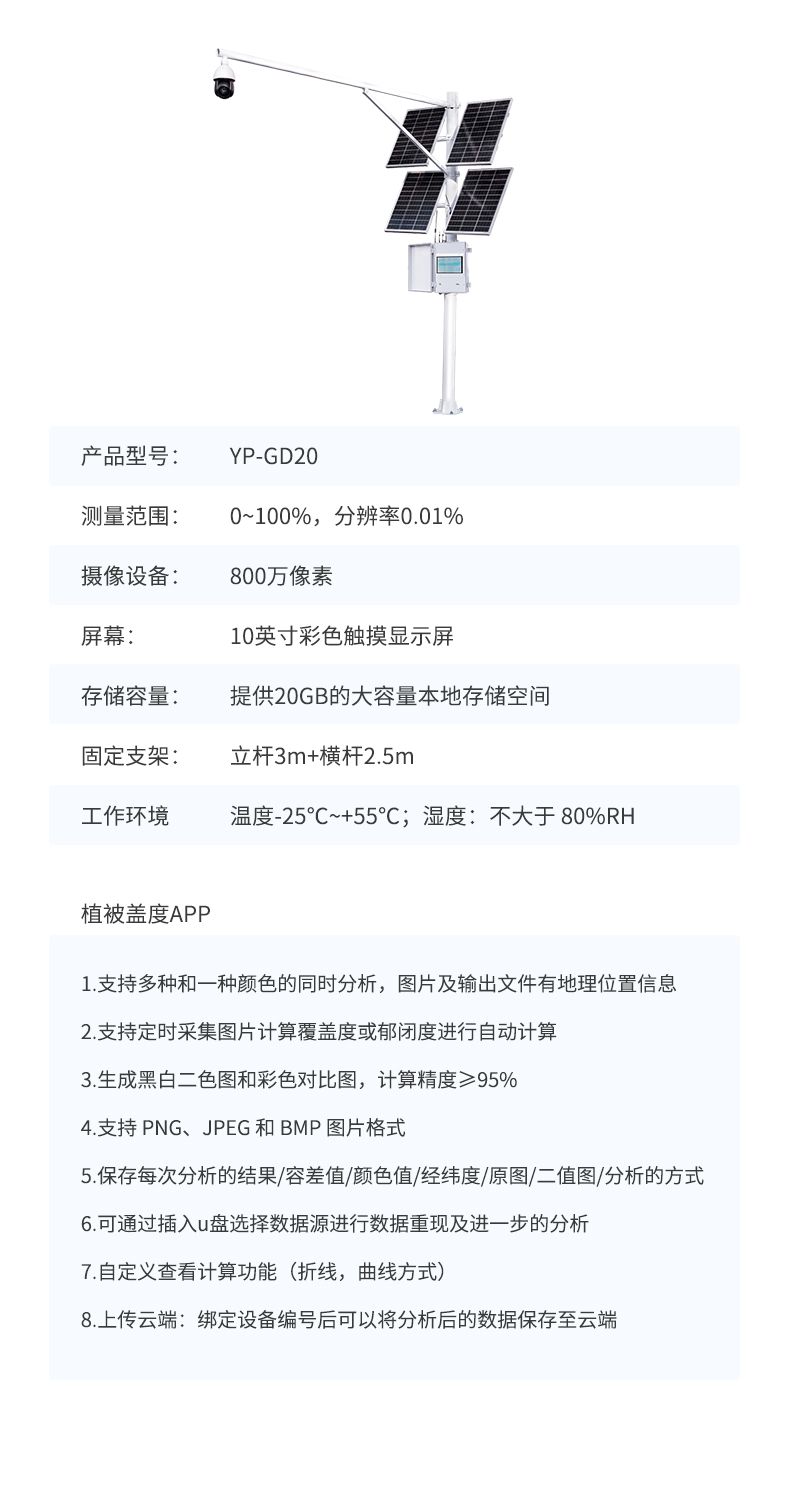 植被蓋度分析系統(tǒng)根據(jù)圖像識(shí)別原理來(lái)實(shí)現(xiàn)自動(dòng)分析,用于植被覆蓋度和郁閉度的精確測(cè)量。儀器具有良好的防水性能,并帶有太陽(yáng)能供電系統(tǒng),可在戶外環(huán)境下長(zhǎng)期自動(dòng)定時(shí)采集分析,獲取植被長(zhǎng)期生長(zhǎng)變化情況。