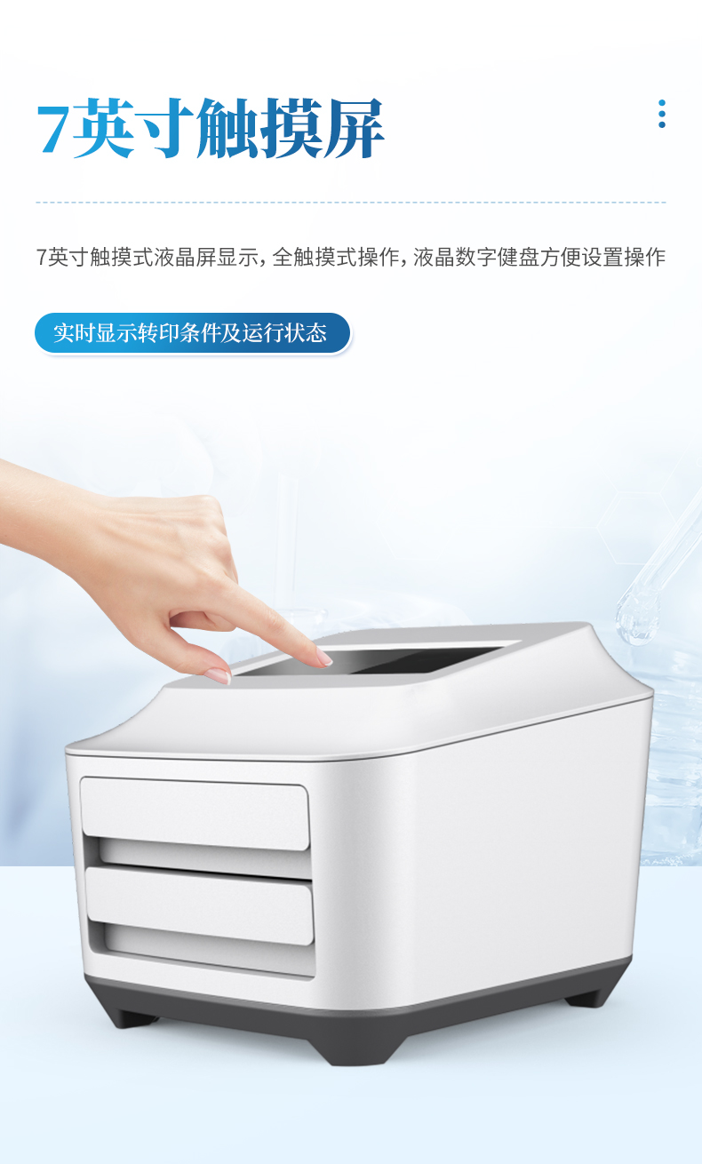 *7寸觸摸式液晶屏顯示,全觸摸式操作,液晶數(shù)字健盤方便設置操作,實時顯示轉印條件及運行狀態(tài)。