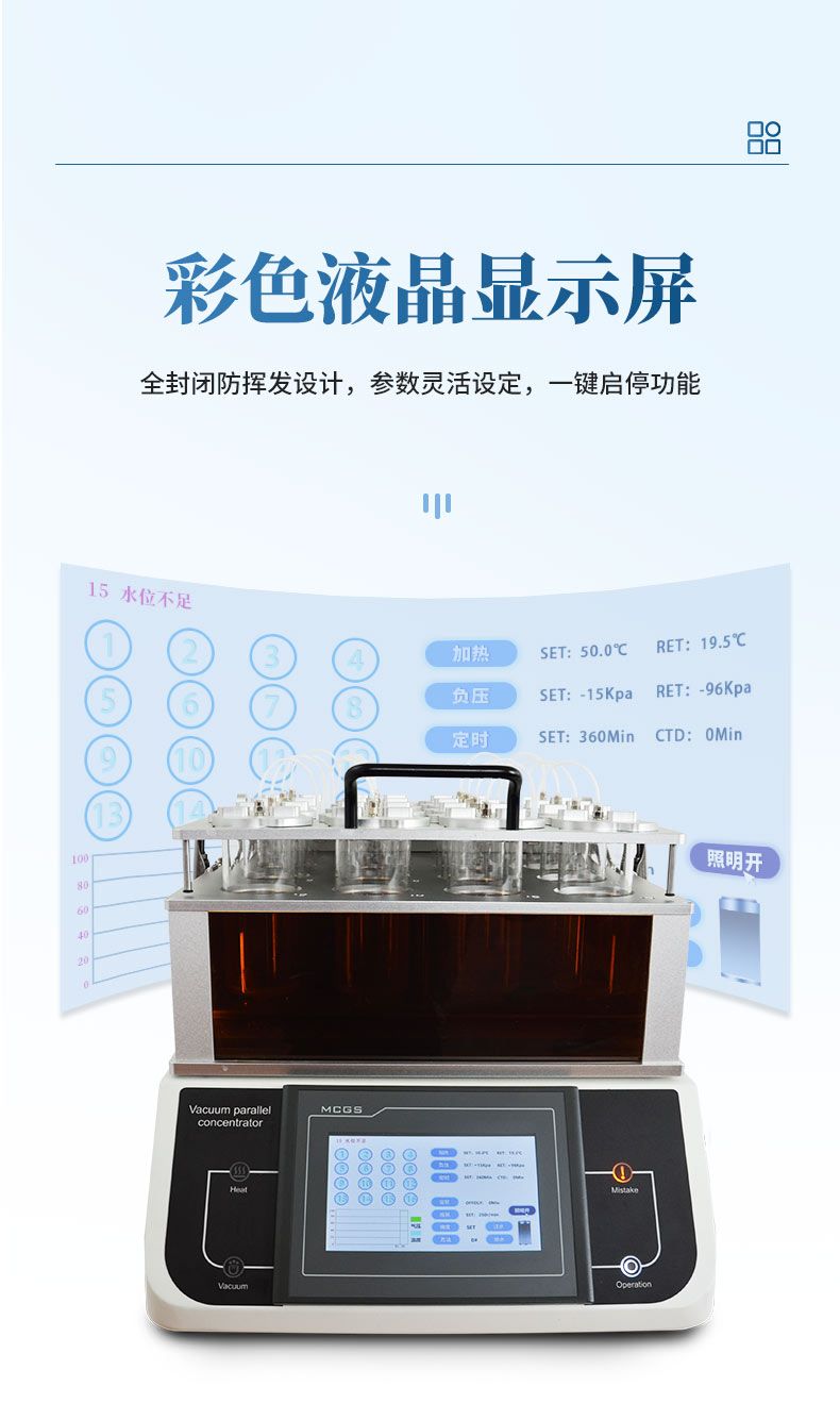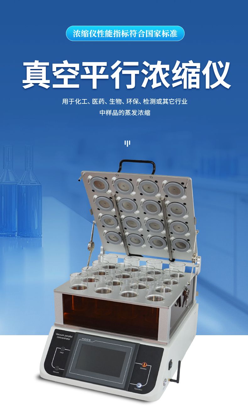 真空平行濃縮儀可對多個樣品進行單獨或者集中密閉蒸發/濃縮,快速有效的回收溶劑,降低了多個樣品的總蒸發時間,增加了處理量,節省了操作實驗時間和實驗資源,平行蒸發儀安裝操作簡單、使用靈活。由于處理條件高度一致,因此平行性也更好。平行蒸發儀主要用于化工、醫藥、生物、環保、檢測或其它行業中樣品的蒸發濃縮。