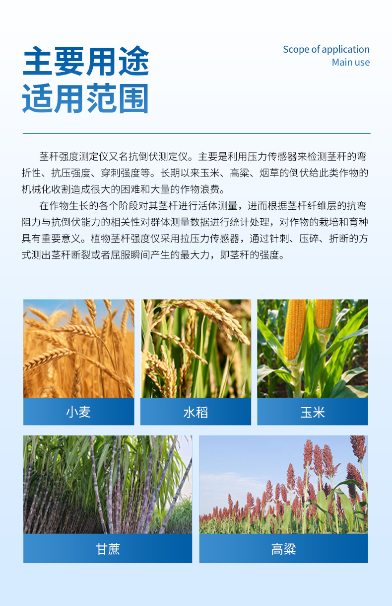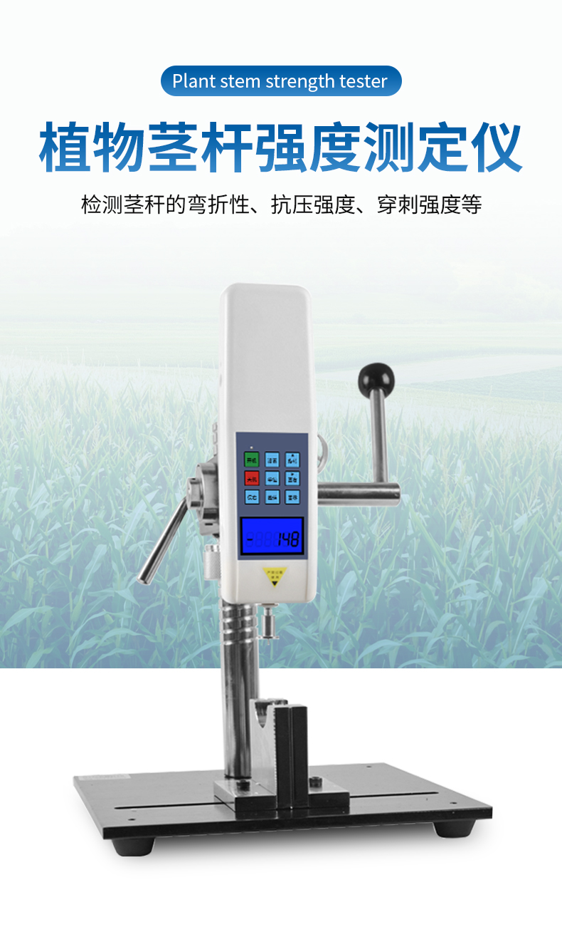 植物莖稈的強度是決定作物抗倒伏能力的一個主要因素,長期以來玉米,高梁、煙草等的倒伏給作物的機械收割造成很大的困難。從機械化水平來說,造成大量的糧食浪費。另外,作物倒伏導致光照不充分,使其生產量受到極大的限制。在作物生長的各個階段對其莖稈進行活體測量,進而根據莖桿纖維層的抗彎阻力與抗倒伏能力的相關性對群體測量數據進行統計處理,對作物的栽培和育種具有重要意義。植物莖稈強度儀采用拉壓力傳感器,通過針刺、壓碎、折斷的方式測出莖稈斷裂或者屈服瞬間產生的最大力,即莖稈的強度