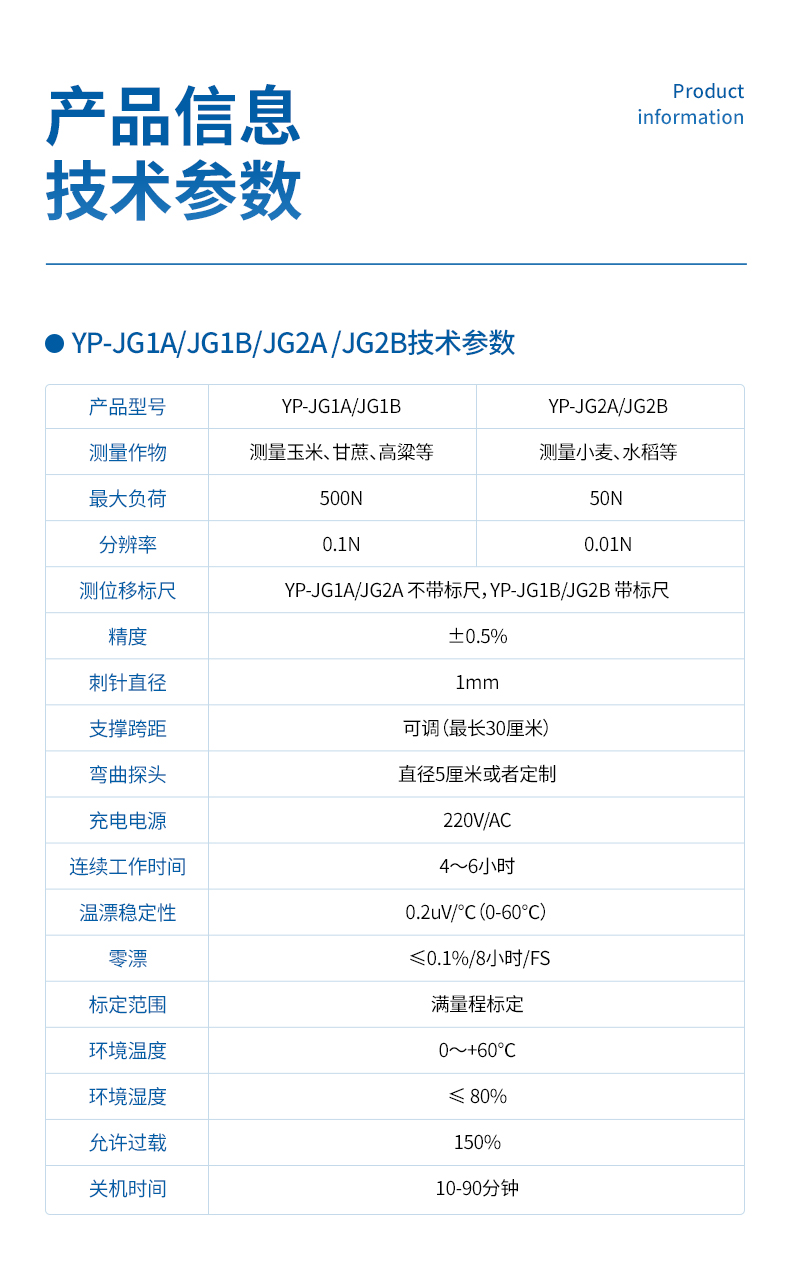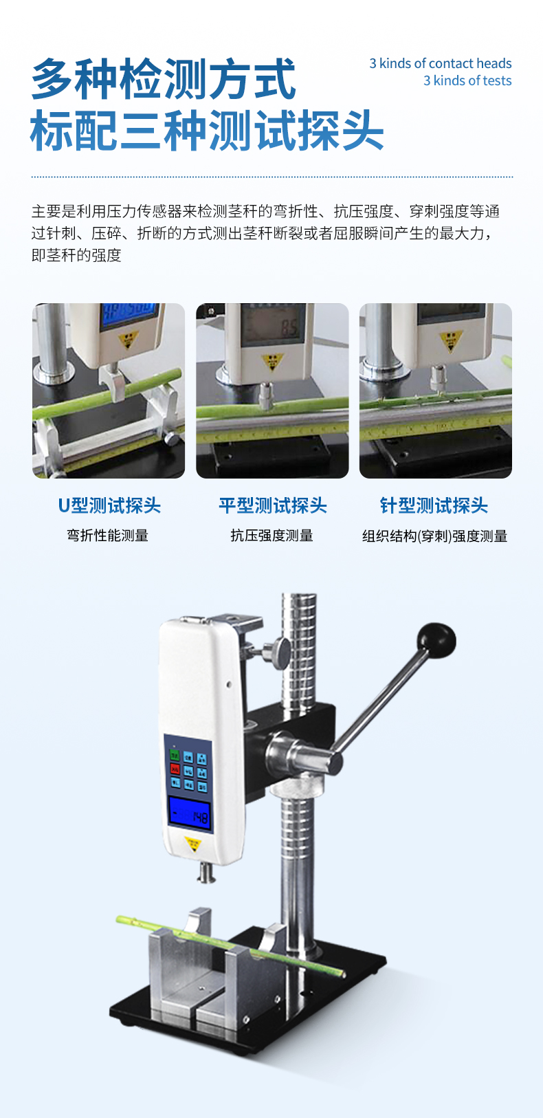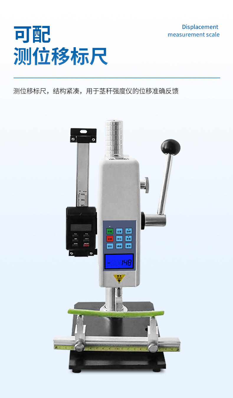 1、三種不同測頭:可進行莖桿彎折性能測量、莖稈抗壓強度測量、莖桿組織結構(穿刺)強度測量;彎折支架距離可調,并標有刻度。