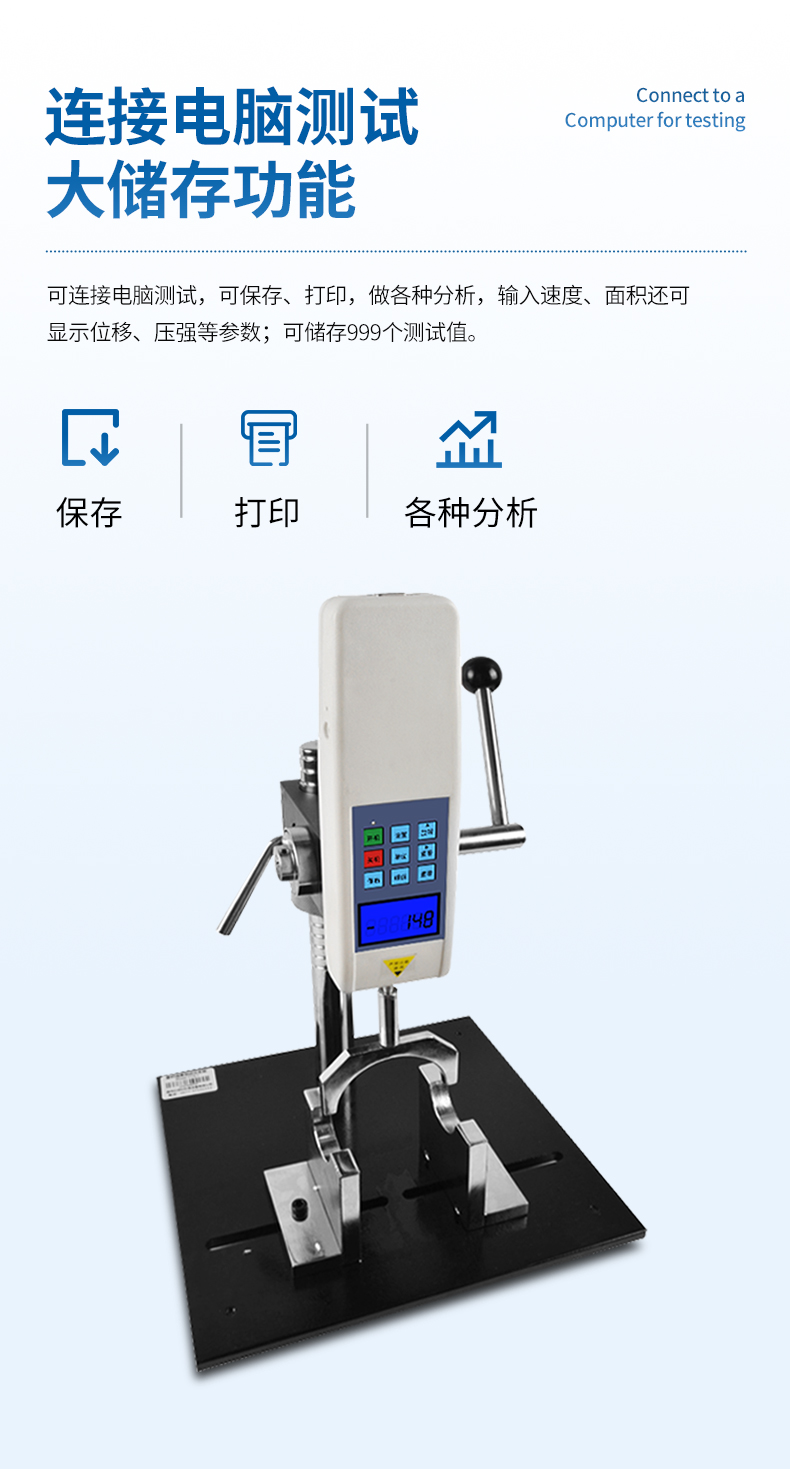 3、可連接電腦測試,可保存、打印,做各種分析,輸入速度、面積還可顯示位移、壓強等參數;