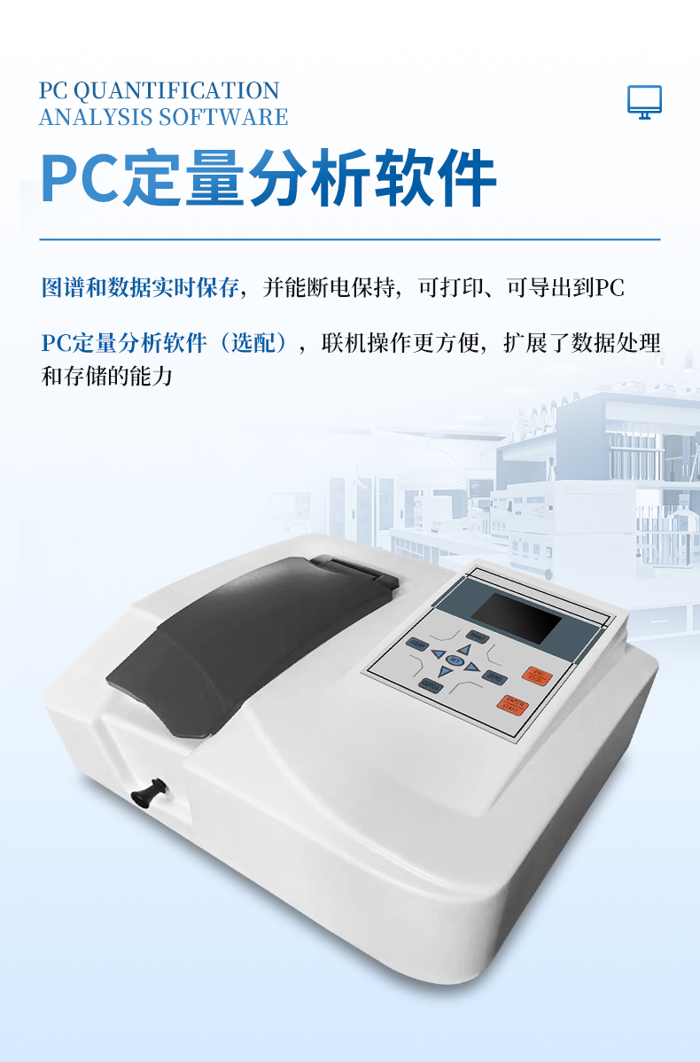 分光光度計,界面友好,操作簡便。主機配有點陣液晶顯示器,可做光度測量和定量測試,標準曲線圖譜直顯。可選配PC掃描分析軟件,擴展了波長掃描、時間掃描、多波長測試和核酸蛋白測試等功能。可用于教學、科研、日常分析等廣泛的需求。
